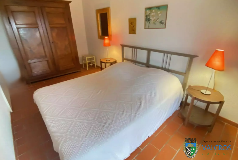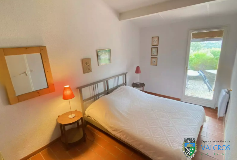 La maison propose deux chambres, dont l’une s’ouvre directement sur la terrasse, prolongeant ainsi les espaces vers l’extérieur. Une salle de bains et des toilettes séparées complètent l’agencement avec praticité.