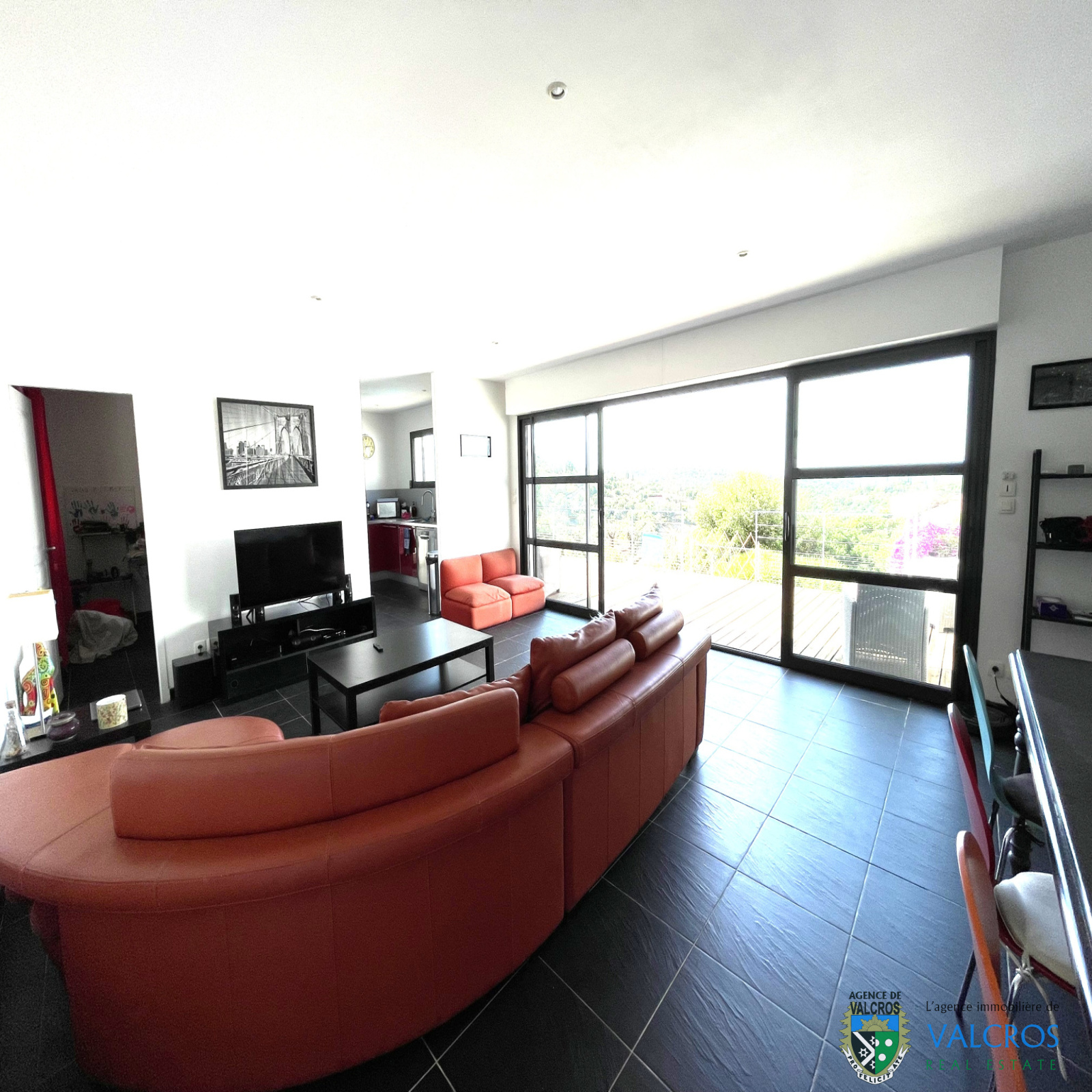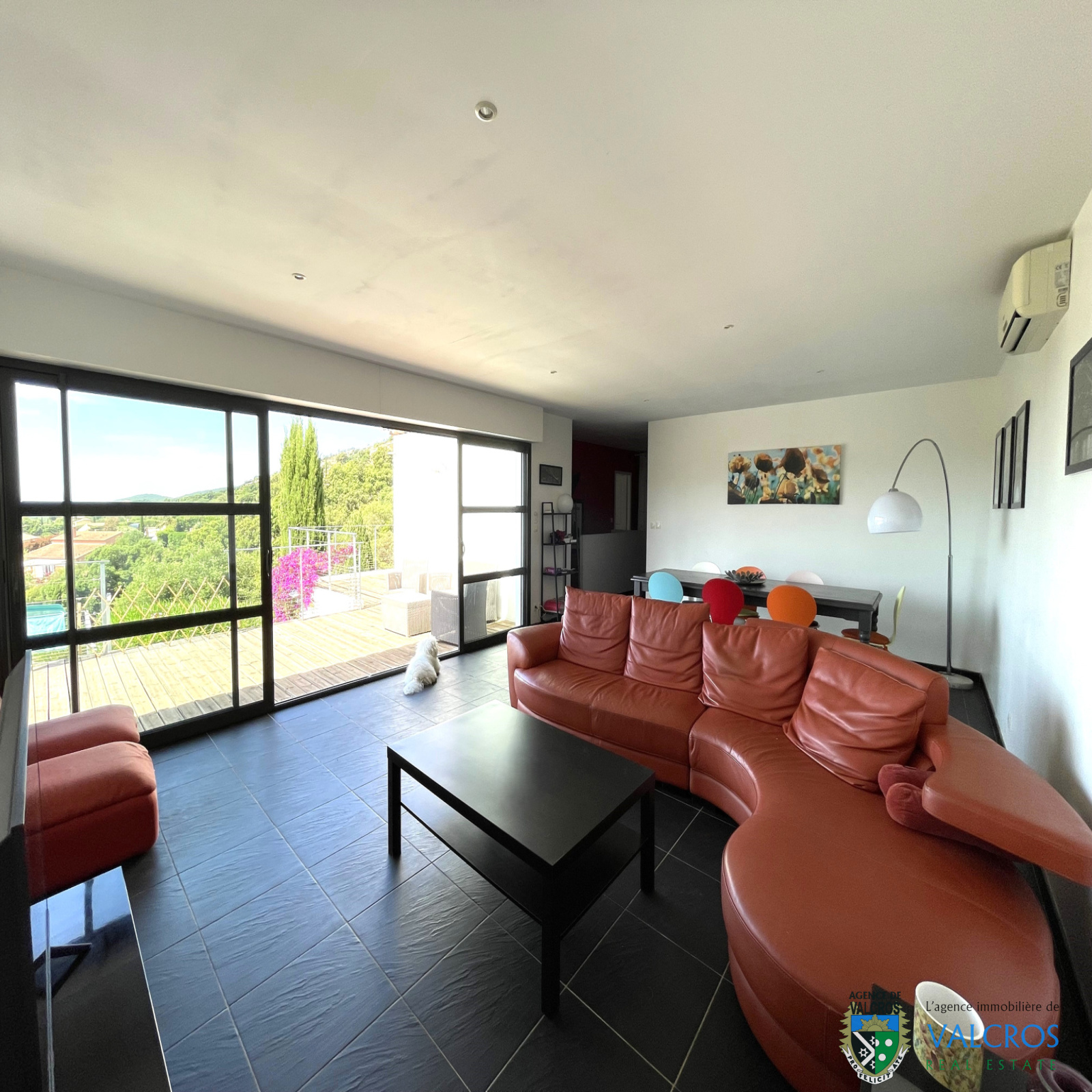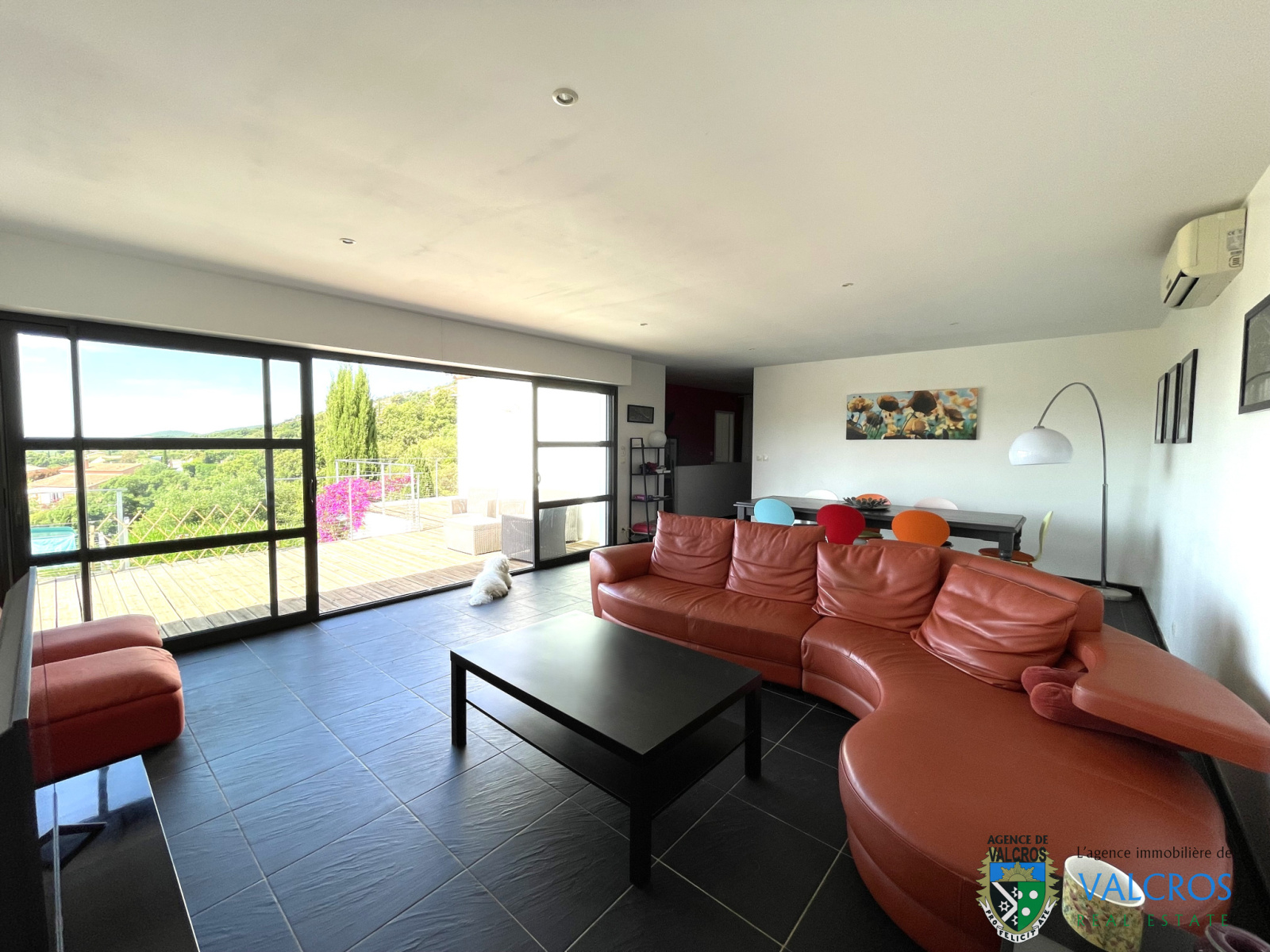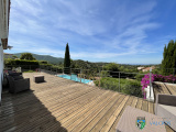 d'un beau salon lumineux avec accès direct par les baies à galandages à une grande terrasse en bois, surplombant la piscine et dominant la vue mer.