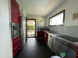 une cuisine moderne aménagée avec accès à la terrasse couverte, véritable espace cocooning abrité prolongeant agréablement l’espace de vie