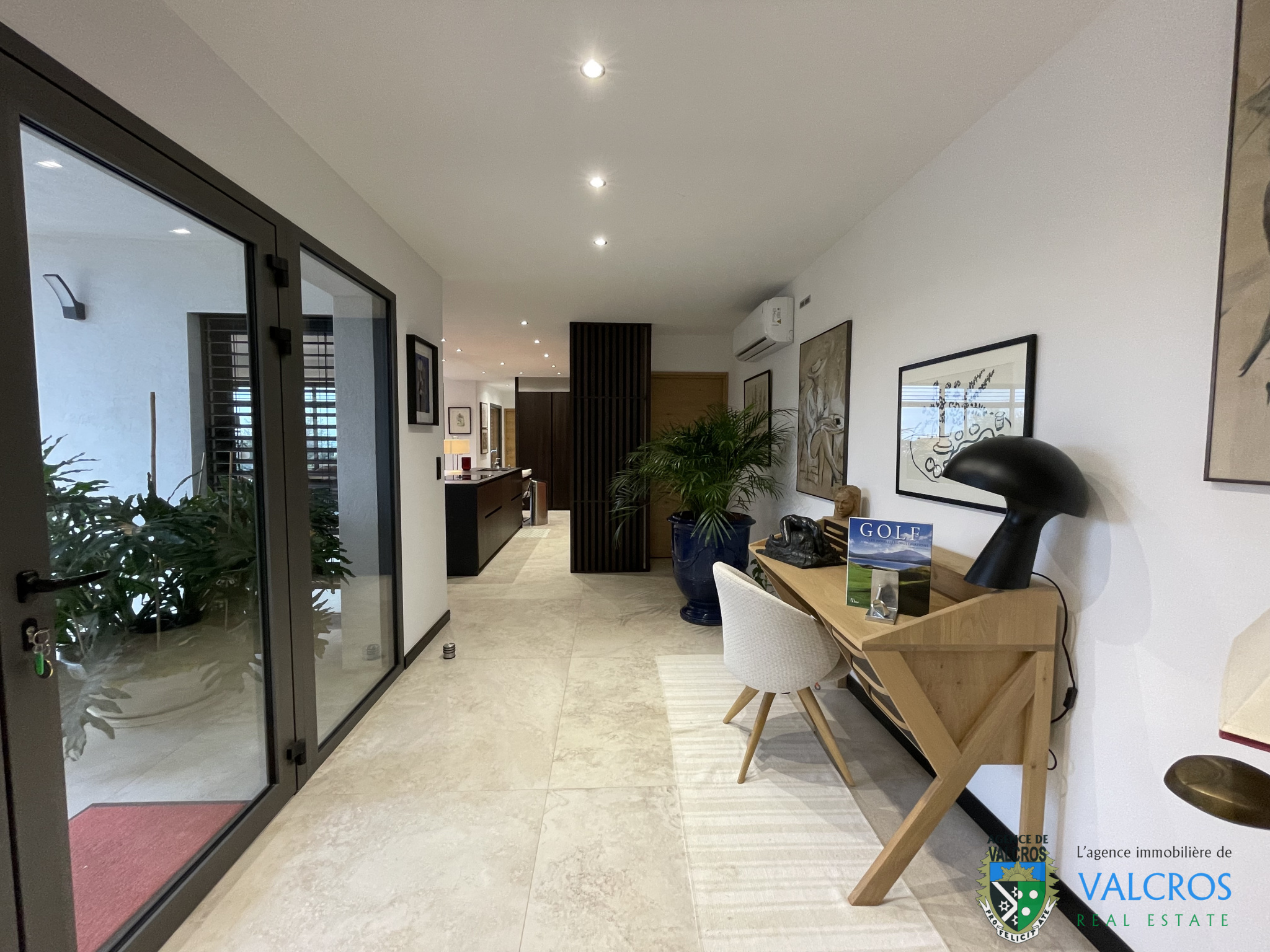 - En complément : un vaste garage de 45 m², pratique pour voitures et matériel de loisirs. A l'extérieur, la villa dispose d'une piscine avec large terrasse plein sud, d'un auvent convivial et d'une vue dégagée sur le golf de Valcros avec une vue mer.