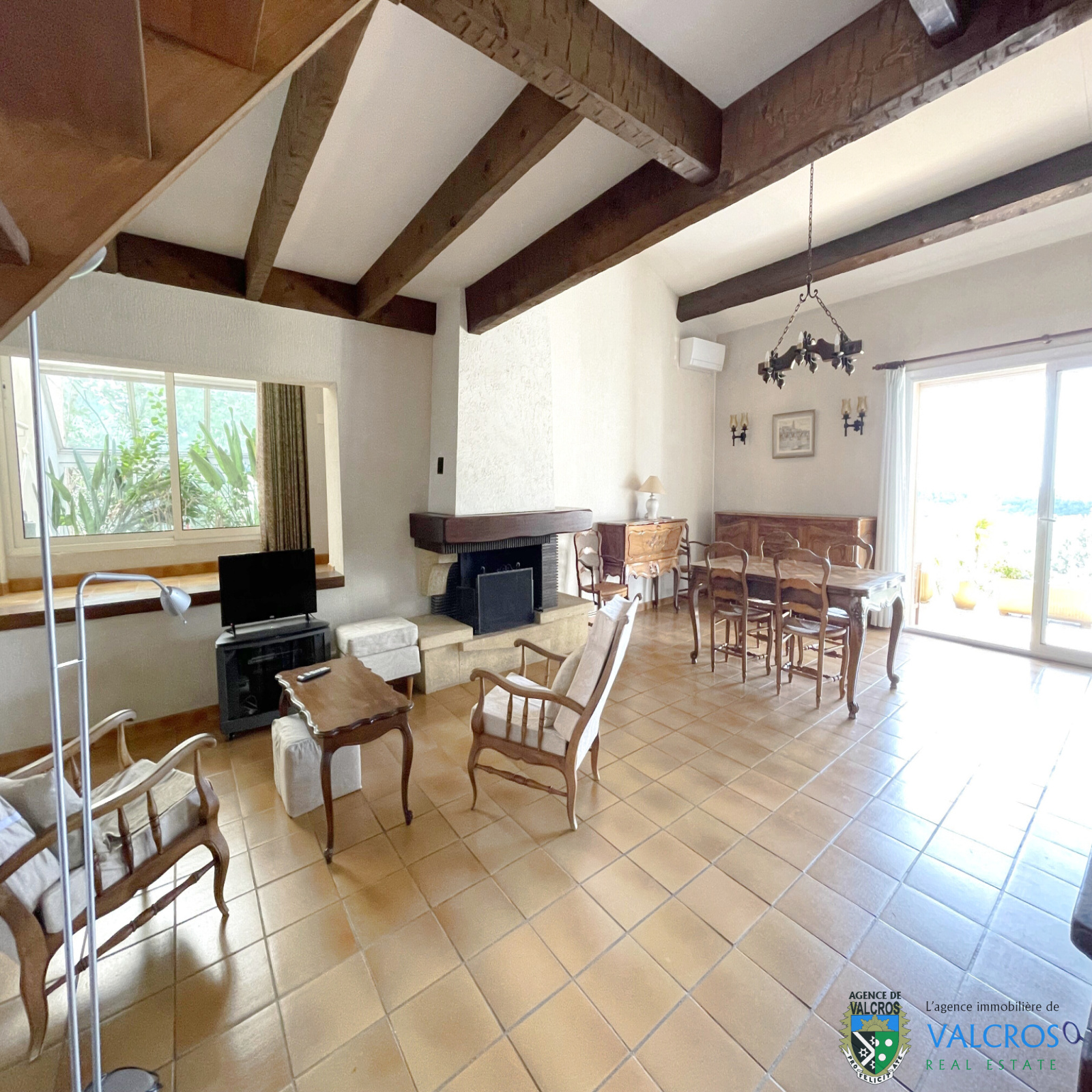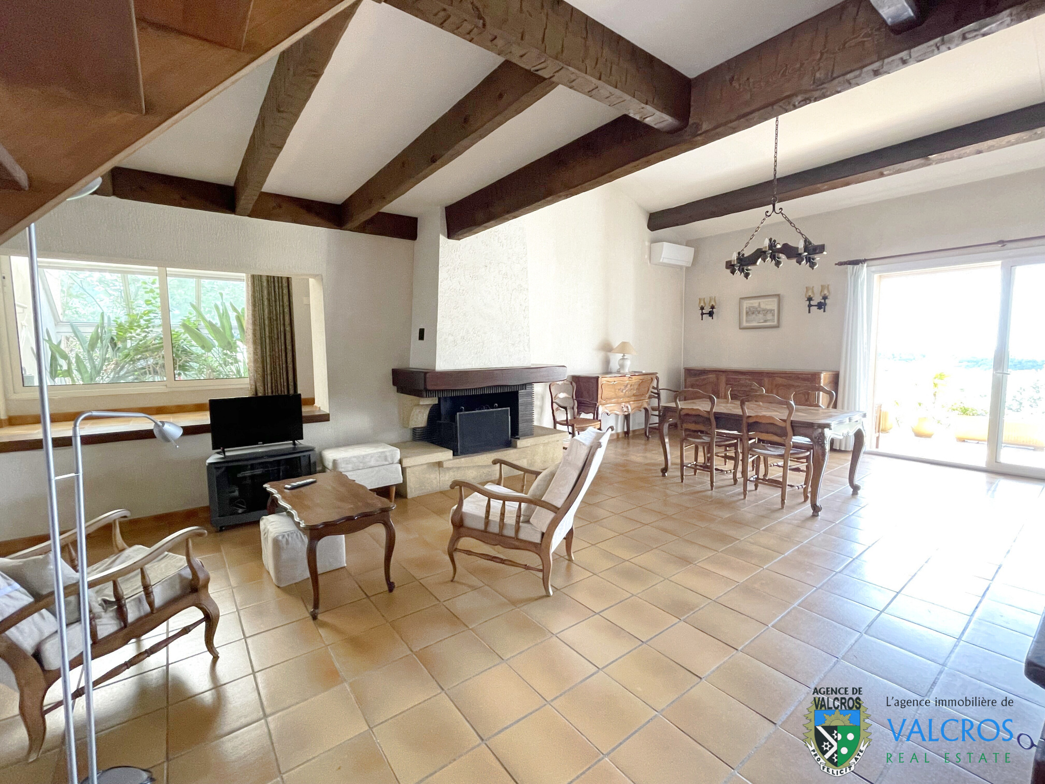 Un intérieur lumineux et convivial : Dès l’entrée, un grand vestibule mène vers un salon avec cheminée, puis une salle à manger baignée de lumière, ouverte sur la terrasse et son panorama exceptionnel.