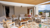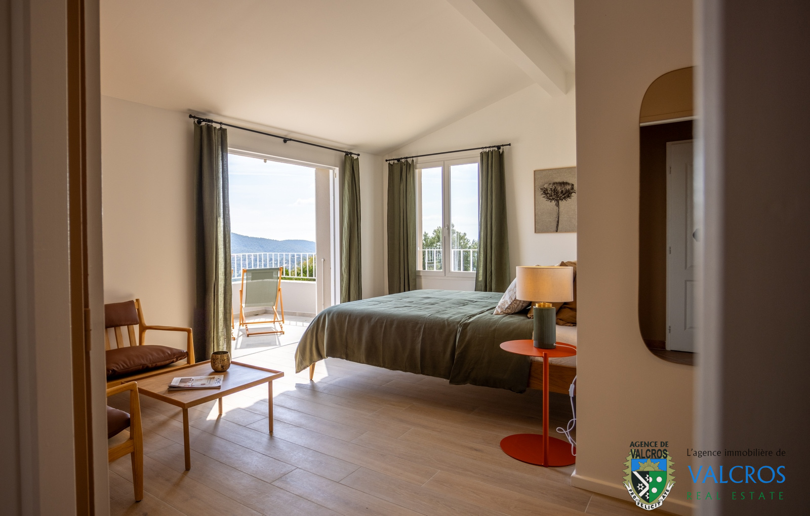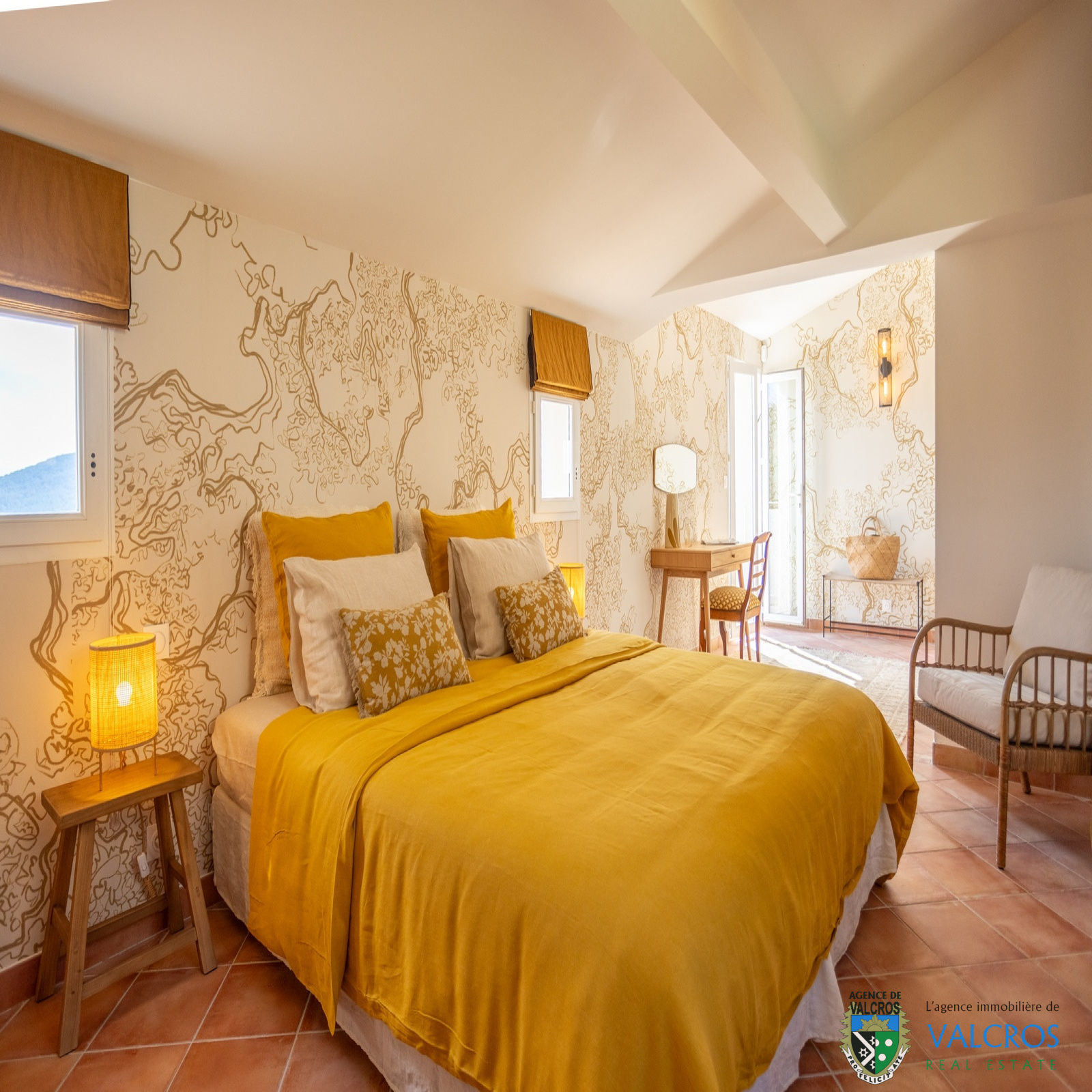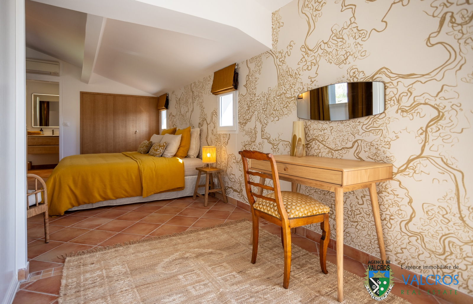 À l’étage, le charme opère de nouveau avec deux suites parentales, véritables havres de paix, bénéficiant d’un accès direct à une terrasse solarium. D’ici, la vue embrasse la mer et les collines dans une perspective à couper le souffle. Un lieu parfait pour contempler les couchers de soleil, verre à la main.