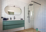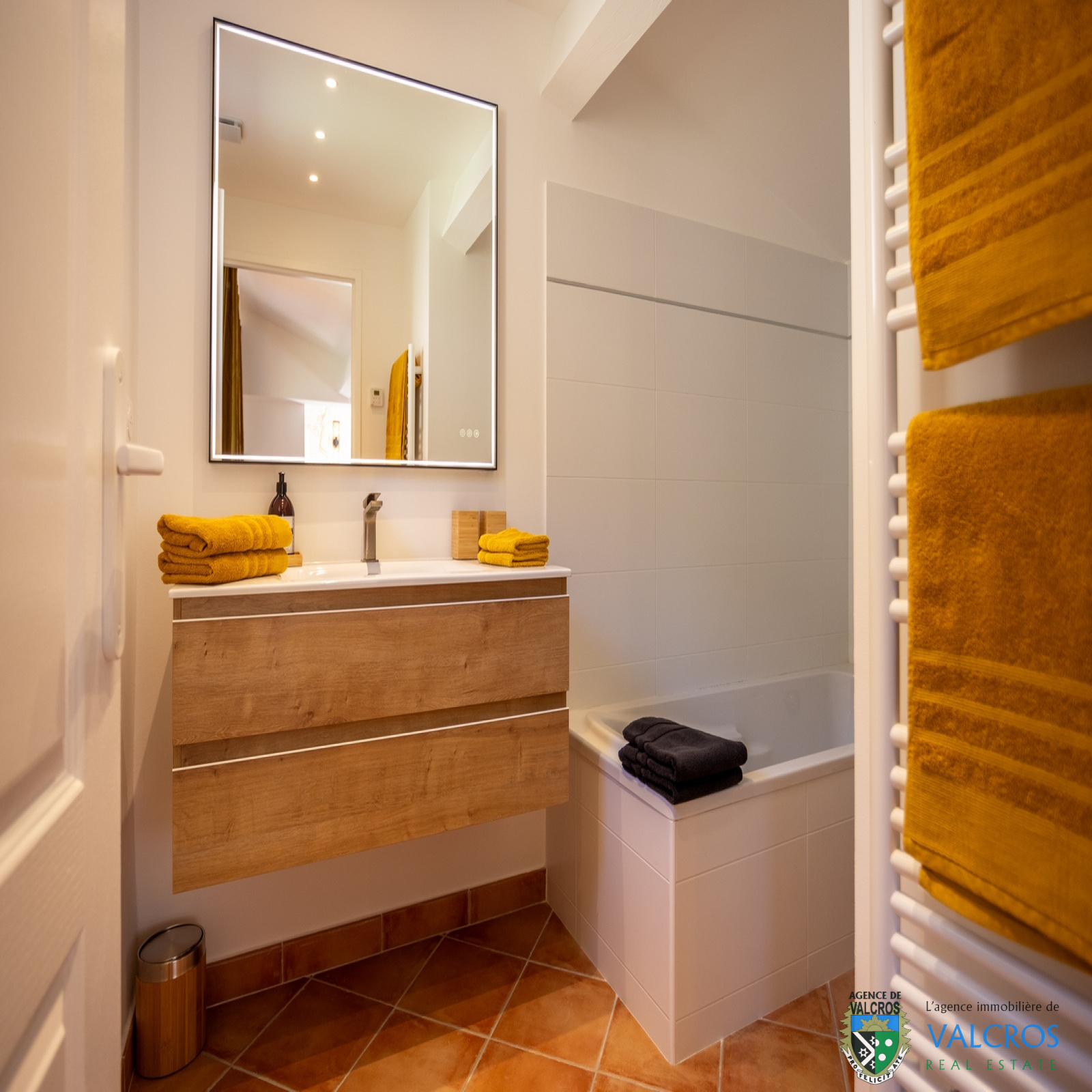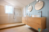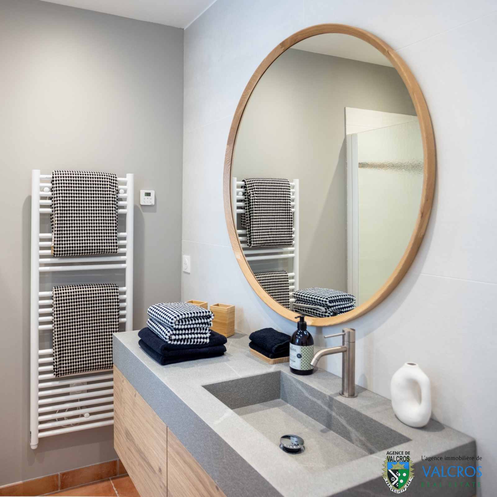 Un couloir mène à l’espace nuit, plus intime, où se dévoilent trois chambres en suite, chacune avec sa salle d’eau et ses WC, ouvrant sur une terrasse orientée à l’est, idéale pour savourer les premiers rayons du soleil. Une buanderie fonctionnelle et un WC invités complètent ce niveau.