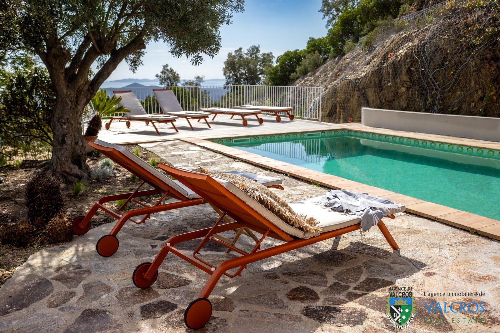 À l’extérieur, la maison déploie ses espaces de vie : Au sud, des toiles d’ombrage et une piscine carrelée de mosaïques, tournée vers la mer, prolongée par une élégante terrasse en bois.