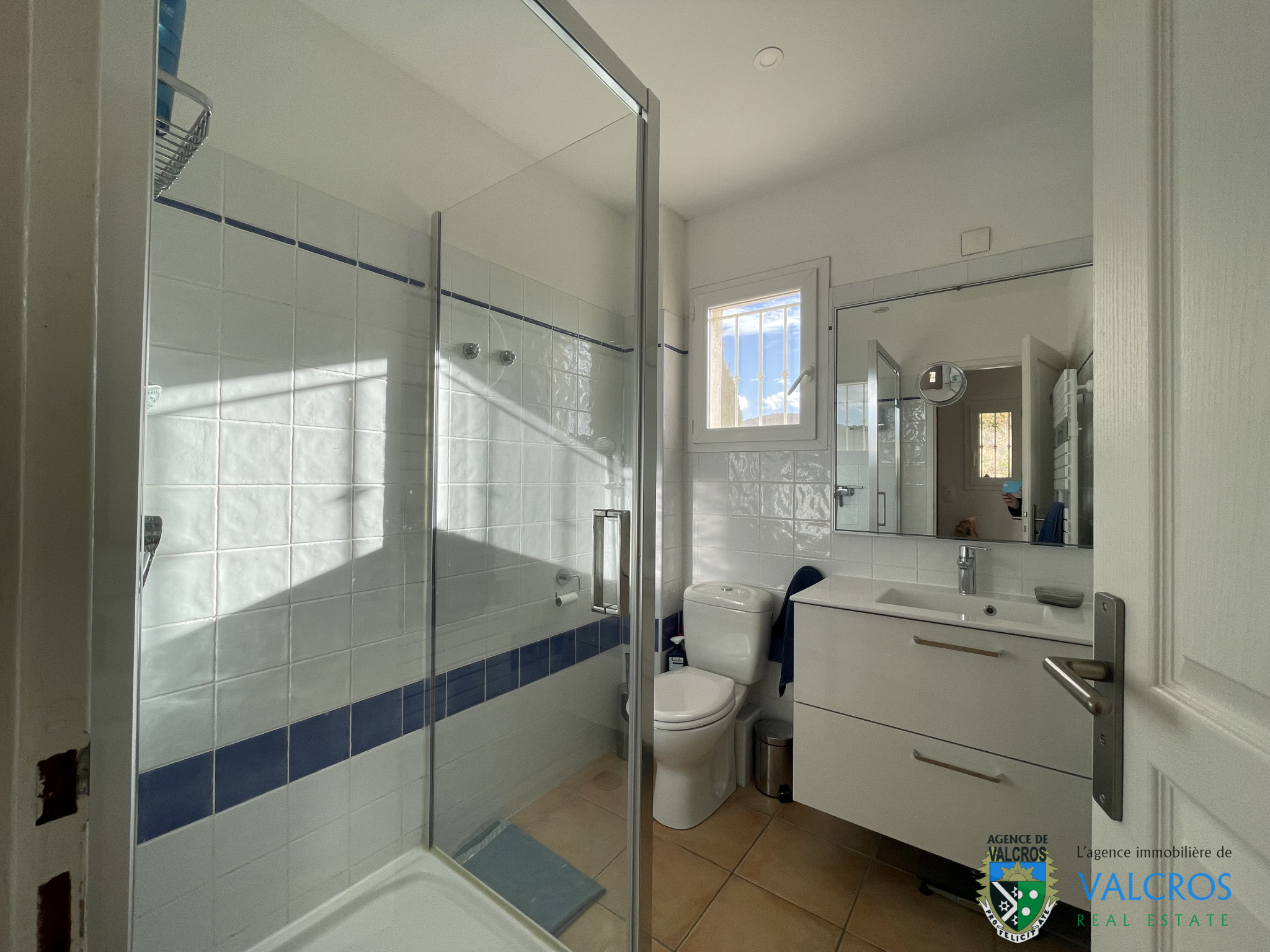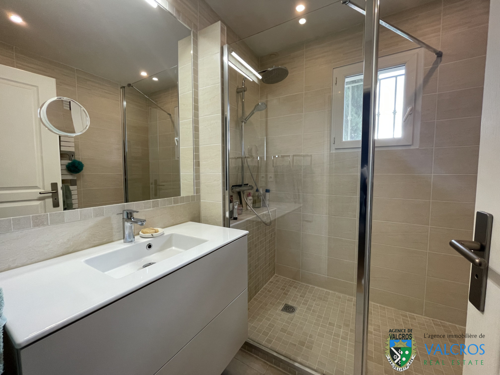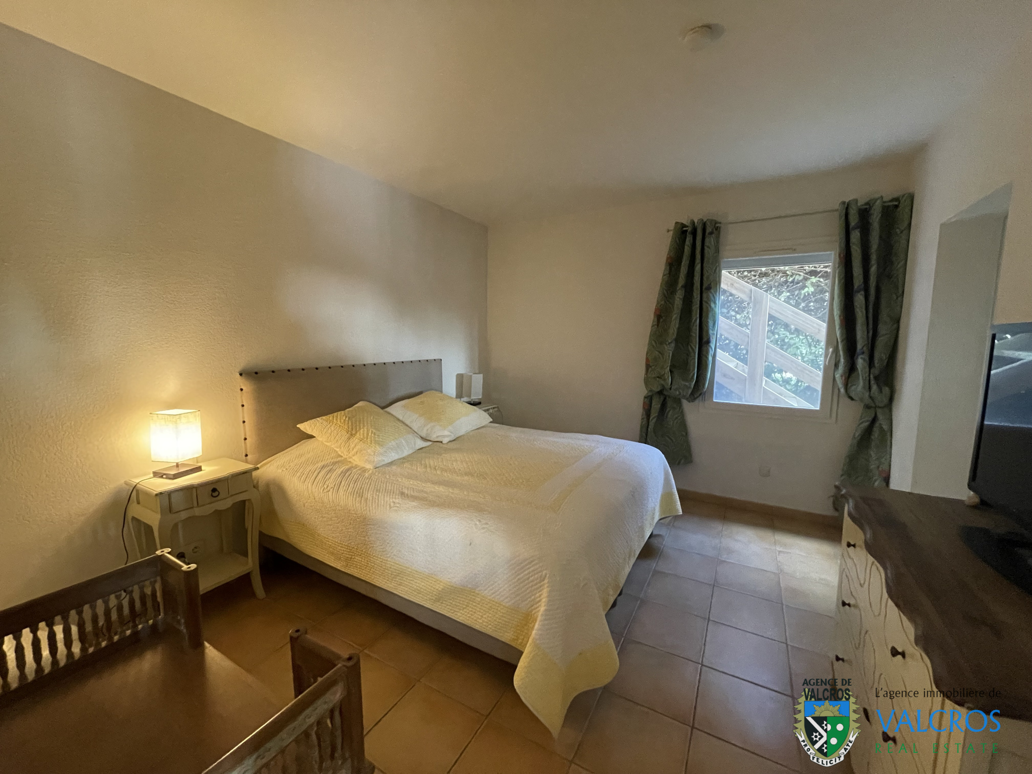 Construite sur un terrain peu pentu entièrement aménagé et paysagé, la villa est composée au rez de chaussée (correspondant à l'étage) et communiquant avec le garage : d'une entrée sur un palier qui dessert deux chambres dont une très spacieuse (avec son grand dressing) et une salle d'eau avec un WC. L'escalier qui descend sur le salon.